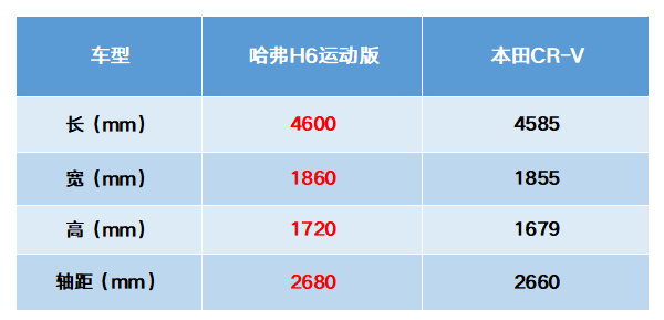 对于一台SUV车型来说,空间始终是消费者购车时看重的条件之一,因为大空间能帮车主解决更多的家用需求。在这一点上,哈弗H6运动版可以说是全面碾压本田CR-V。哈弗H6运动版长宽高分别为4649 mm、1852 mm、1710mm,轴距更是达到了2680mm,整车尺寸全面超越本田CR-V。