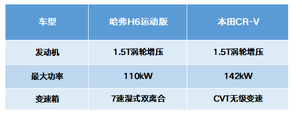 哈弗H6运动版采用的是7速湿式双离合,而本田CR-V是CVT无级变速箱。从不可逆的物理特性来讲,7速湿式双离合动力响应迅速并且动力传递效率高,自然哈弗H6运动版的动力感受要比本田CR-V强劲许多。