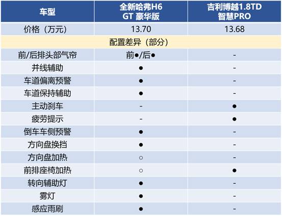 接下来对比配置,通过下面表格不难发现,虽然吉利博越PRO拥有几项全新哈弗H6 GT版不具备的配置,但全新哈弗H6 GT版的配置却更加全面,优势配置更多,表现更出色。