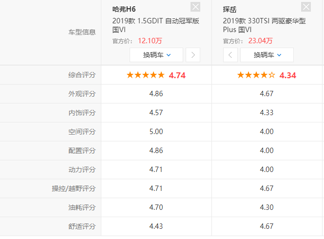 以哈弗H6及大众探岳为例,在太平洋汽车网上,哈弗H6以4.74的行业高分(满分5分),力压探岳的4.34分。具体到各个细节的口碑情况,哈弗H6在外观、内饰、配置、动力、越野/操控、油耗等方面全面领先于探岳。尤其在空间表现上,哈弗H6更是以100%的好评率,豪夺5.0分的满分成绩!而在外观、配置上也以4.8+,动力、越野/操控、油耗全部4.7+的成绩,成为行业的领先水平。