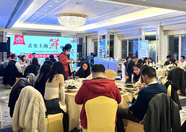 20211216日,美国阿拉斯加海产在上海浦东香格里拉酒店举办了一场贸易商交流会暨海鲜品鉴晚宴。当晚,美国驻上海总领事馆农业贸易处农业领事Erik Hansen美国阿拉斯加海产中国市场代表、六十余位贸易商以及媒体莅临现场。酒店厨师运用美国阿拉斯加黑鳕、狭鳕、鲽鱼、海参、红鱼和六线鱼现场烹饪了多道菜品,色香味美,备受好评。