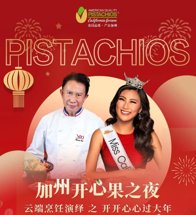 本次活动的两位重磅嘉宾,在大家的期待中闪亮登场,他们分别是2022 James Beard终身成就奖获得者,国际名厨甄文达(Martin Yan),以及2022年度加州小姐梁滢(Catherine Liang),她作为美国开心果的形象大使,带着她的美好新年祝福还有健康秘诀,和大家一起迎接新年。美国开心果受到加州小姐的青睐,也正是她的健康秘诀,每天食用美国开心果,提高抗氧化力、补充蛋白质,是她的营养源泉。