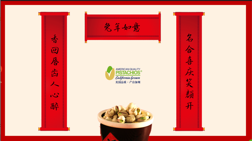 “香回唇齿人心醉,名合喜庆笑颜开,兔年如意!”让我们把美好的祝福通过一幅对联送给每一个人,有了美国开心果的陪伴,让这个春节更美味,更圆满,更欢喜。展望来年,美国开心果将继续带来更多有新意的活动,祝福大家,新年快乐。
