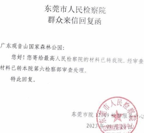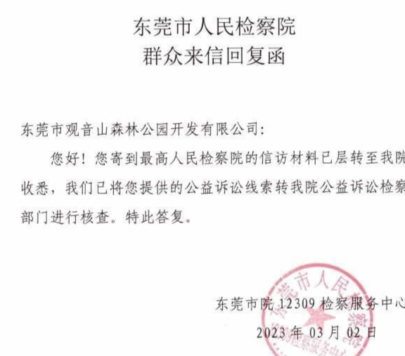 2023年3月2日,东莞市检察院告知观音山公园:其提供的公益诉讼线索转该院公益诉讼检察部门进行核查。