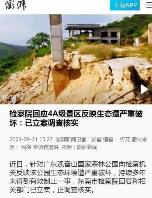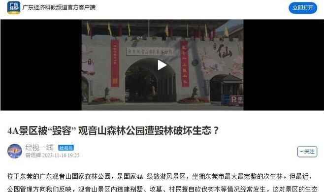 2023年11月16日,广东广播电视台经济科教频道报道《4A景区被“毁容” 观音山森林公园遭毁林破坏生态?》