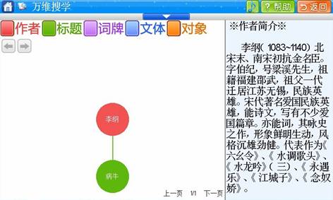 如果要了解作者李纲,就会显示如上界面,与其相关的是《病牛》,呈现绿色表示这是标题名称,右面会显示作者的简介。