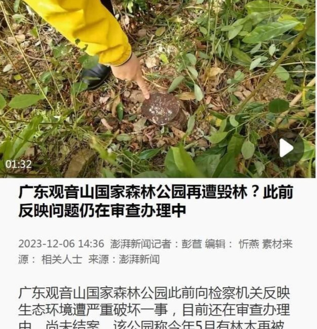 2023年12月6日,澎湃新闻报道《广东观音山国家森林公园再遭毁林?此前反映问题仍在审查办理中》。这显示出,观音山毁林现象在当年3月初虽经东莞市检察院受理调查,但到年底了还在审查之中。那么审查从2023年3月到如今的2025年2月下旬,有结果吗?笔者联系观音山公园,回复是没有任何结果。